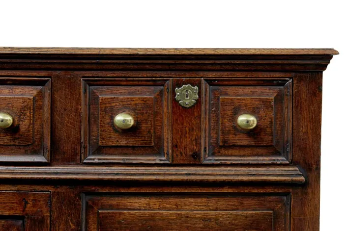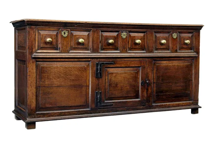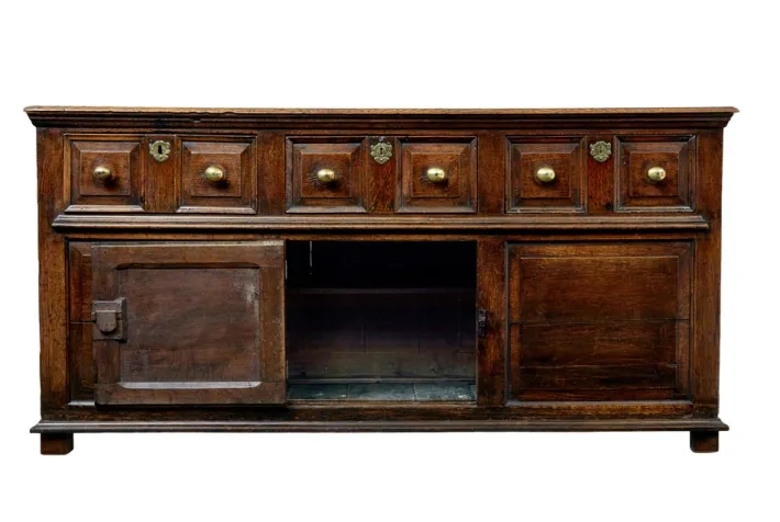 4 plank top surface with beaded rack support applied along the last plank at the back. Over-sailing moulded edge, below which are 3 deep drawers fitted with brass handles and escutheons on fielded panels. Below a single door cupboard which allows access left and right, additional storage provided by a fixed shelf along the whole length.