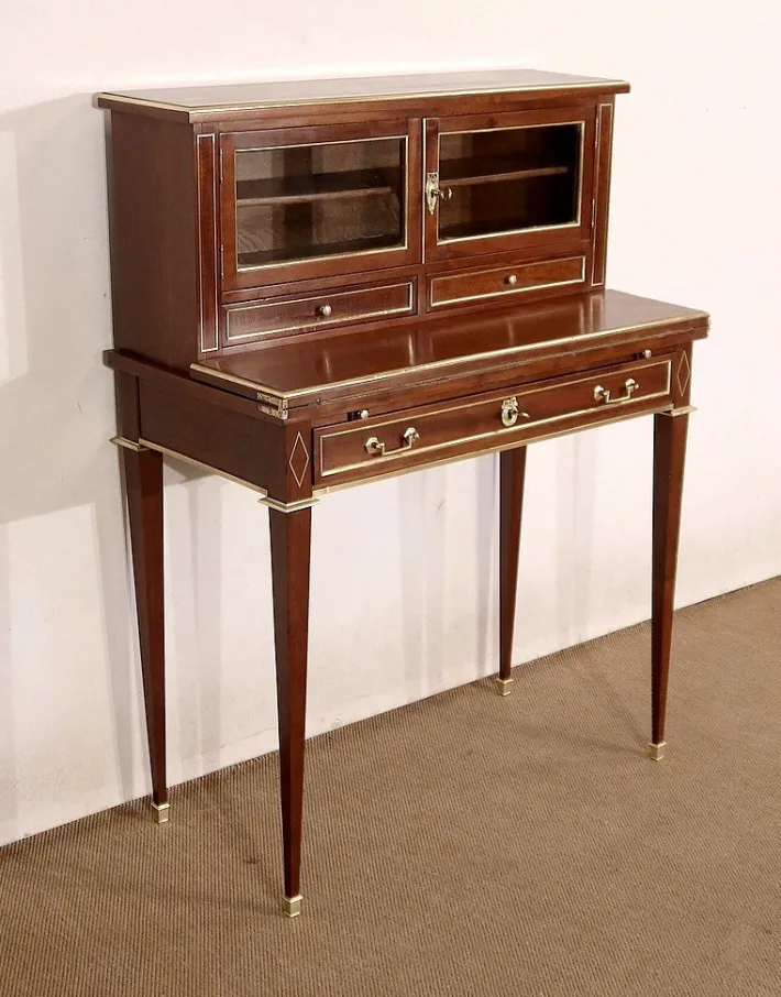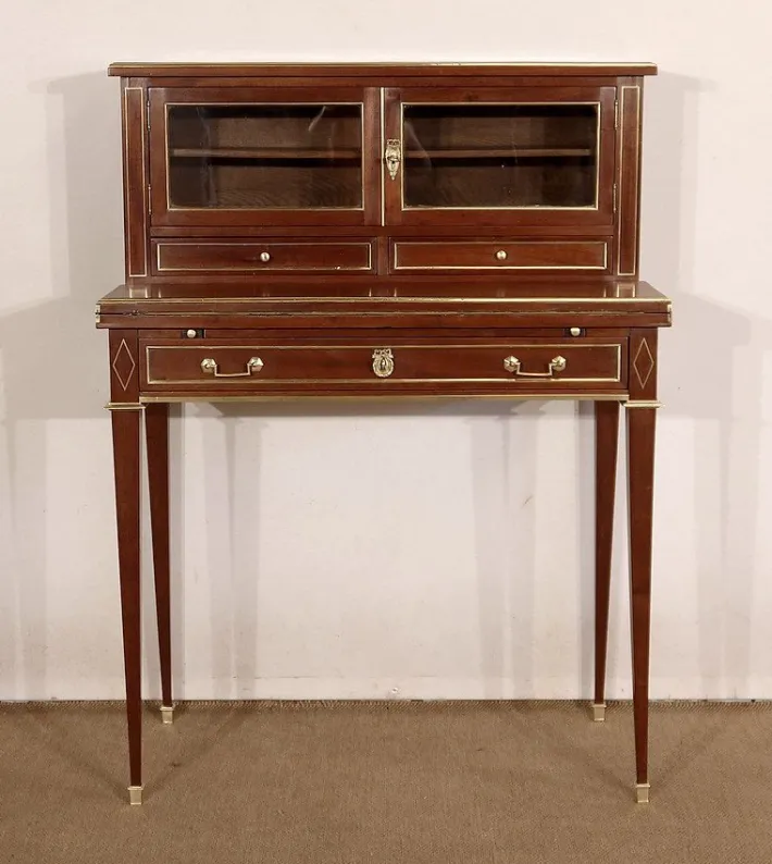 Its center is equipped with a single drawer whose front is surrounded by a brass quarter round. Two Louis XVI brass handles frame an authentic lock in working order, with an oval bronze entrance topped by a Louis XVI knot. On each side, a brass inlay forming a rhombus brings a touch of originality to this property. On top, two pulls with “lens” buttons allow the writing part to be held in place, which unfolds thanks to hinges. We discover an interior part darkened by a green leather almond with cold vignette, golden vignette and angles with golden patterns too.