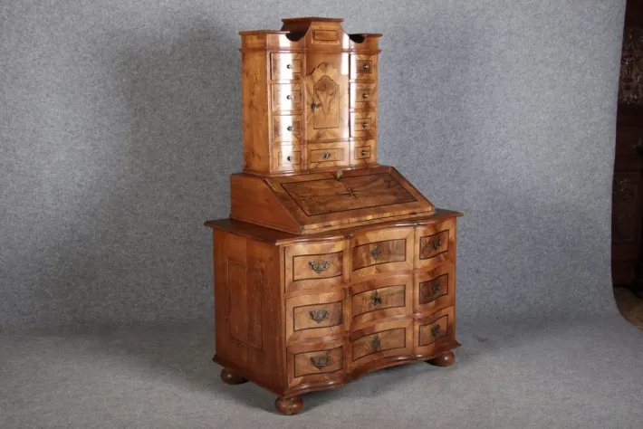 Partly supplemented, damaged, with missing parts, shrinkage, old restored, see pictures. The piece of furniture has no active worm infestation. Pictures are part of the auction.