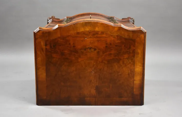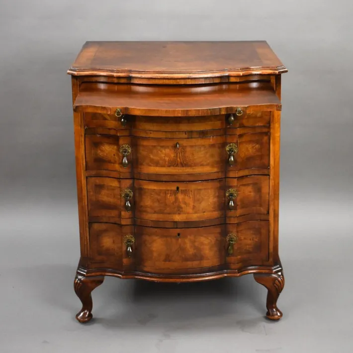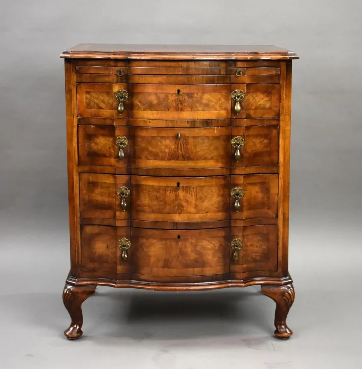 Key Features: * Elegant antique serpentine front chest of drawers * Figured walnut veneers with book-matched drawer fronts * Four graduated drawers with brass drop handles * Cabriole legs with carved shell knees and pad feet * Attractive shaped frieze and well-balanced proportions * Excellent condition, ready for use Dimensions: * Width: 63 cm * Depth: 46 cm * Height: 78 cm