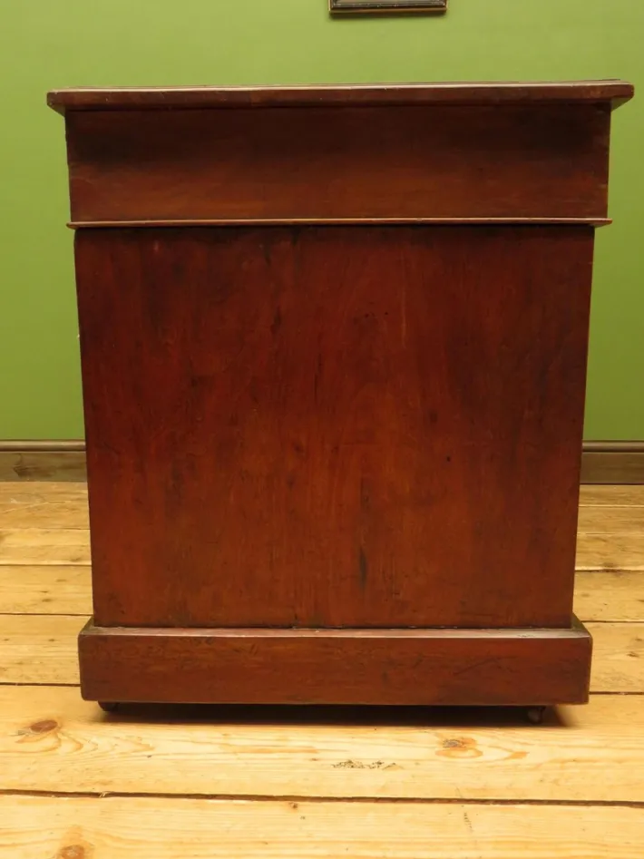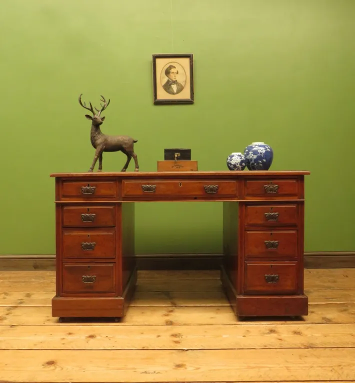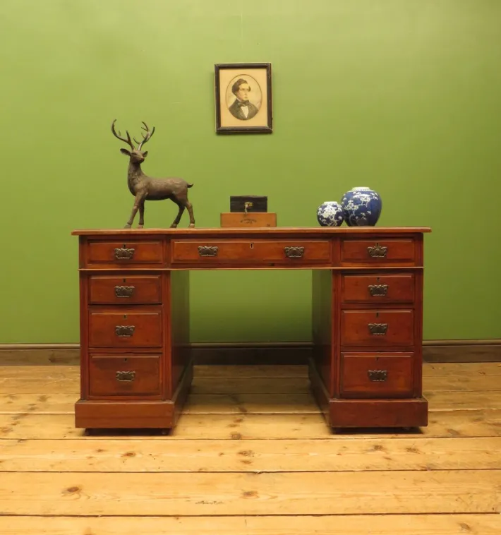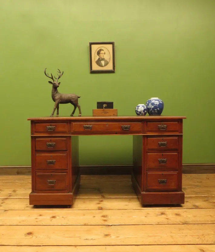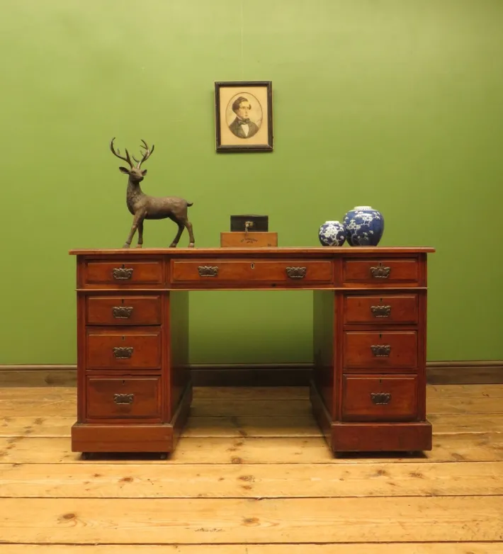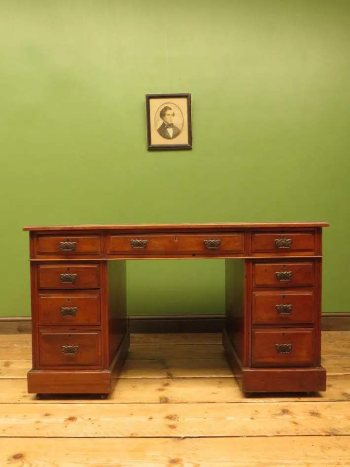Each pedestal has three spacious drawers which are finished with decorative drop handles, these are set under three further drawers and to the top the desk is inset with a heavily aged piece of brown leather.