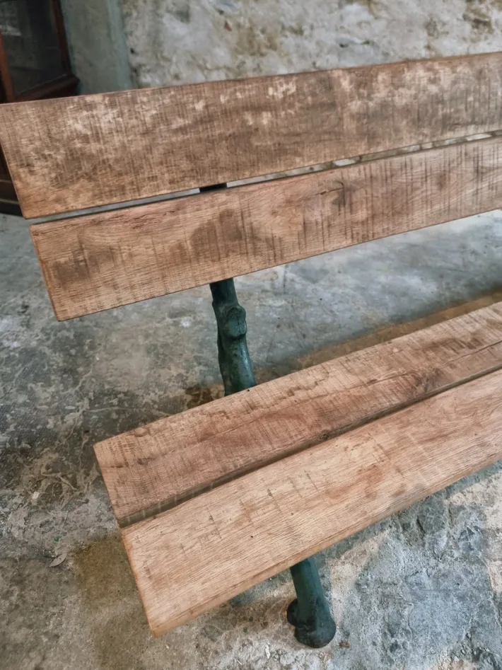 The solid oak slats show the natural grain of the wood, offering both strength and a classic appearance. The cast iron frame provides stability and durability, making this bench suitable for both indoor and outdoor use.