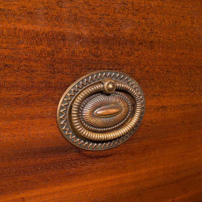 Each drawer dressed with quality drop handles sitting upon decorated oval backplates