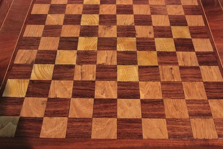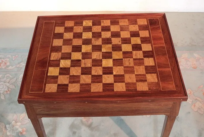The removable top is in rosewood and ash veneer with a checkerboard pattern and solid mahogany surround, while the reverse is covered with green felt.