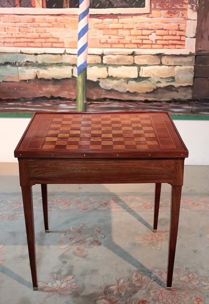 This top reveals a tric-trac game with a solid mahogany back with lemon and stained wood inlays. Enclosed are 24 boxwood and 24 rosewood pucks.
