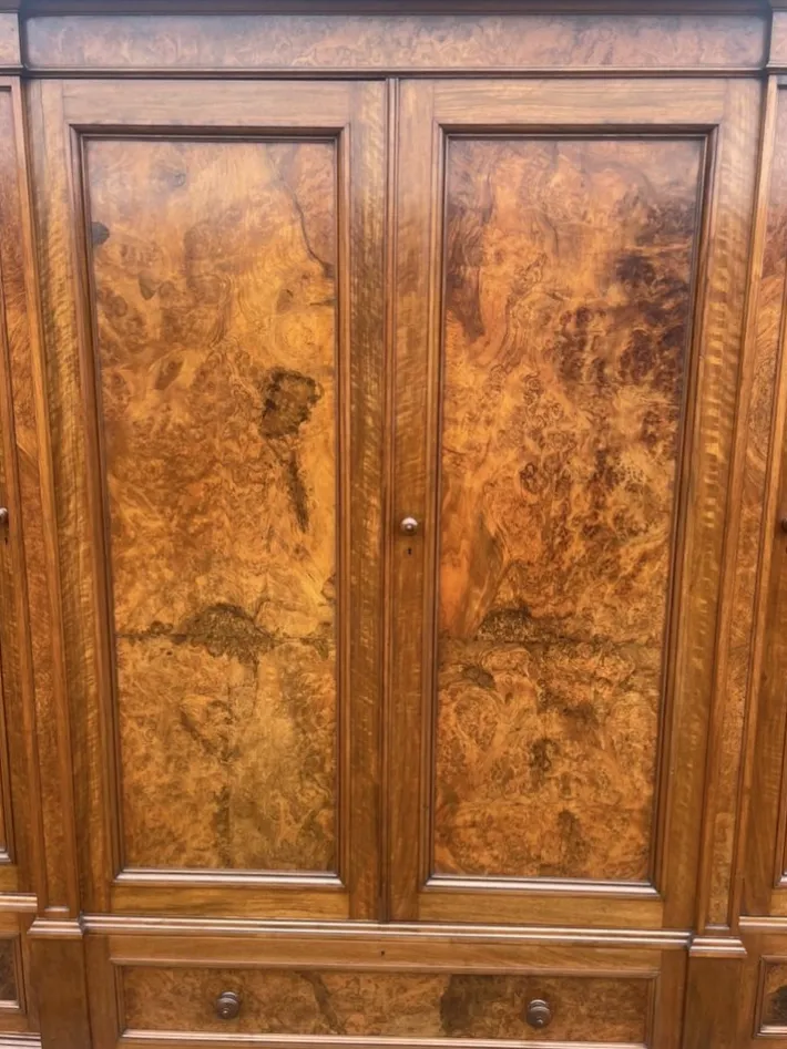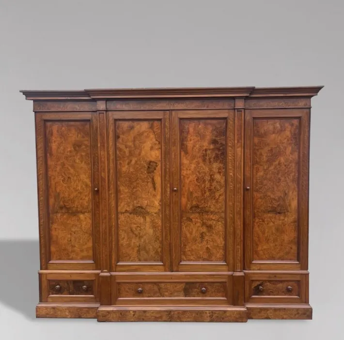 Very impressive mid-19th century, early Victorian period burr walnut 4-door breakfront wardrobe is a true statement piece. Crafted circa 1860, it features a moulded cornice above four long panelled doors in beautifully figured burr walnut. Below the doors is one long central drawer, flanked by two more drawers, all with original turned wooden handles and locks with a working key.