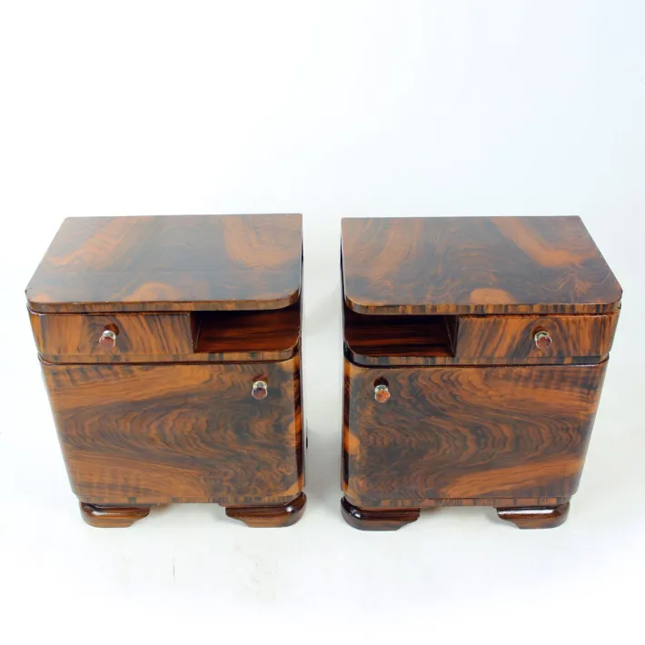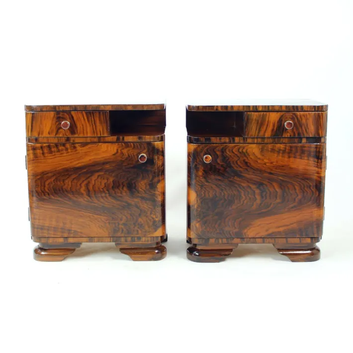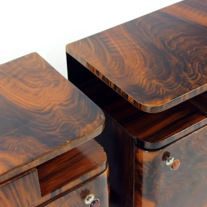 Each table features a spacious drawer and a lower compartment with a hinged door, offering practical storage while maintaining a sleek silhouette. The original resin and chrome handles add a subtle unique touch, beautifully complimenting the rich wood-effect finish.
