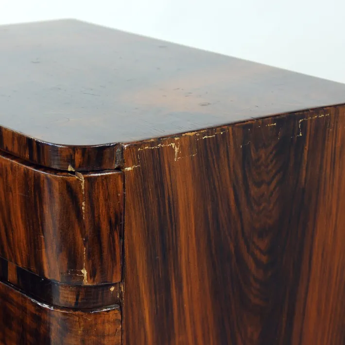 The surfaces are finished using the traditional faux wood graining technique (also known as wood graining), a hand-painted decorative process popular at the time. This technique was employed both for its cost-effectiveness and for its ability to imitate rare or exotic wood species — and here, it has been beautifully preserved, enhancing the tables’ historical and artistic value.