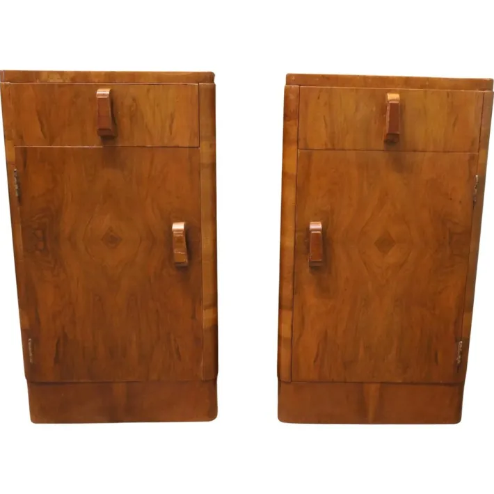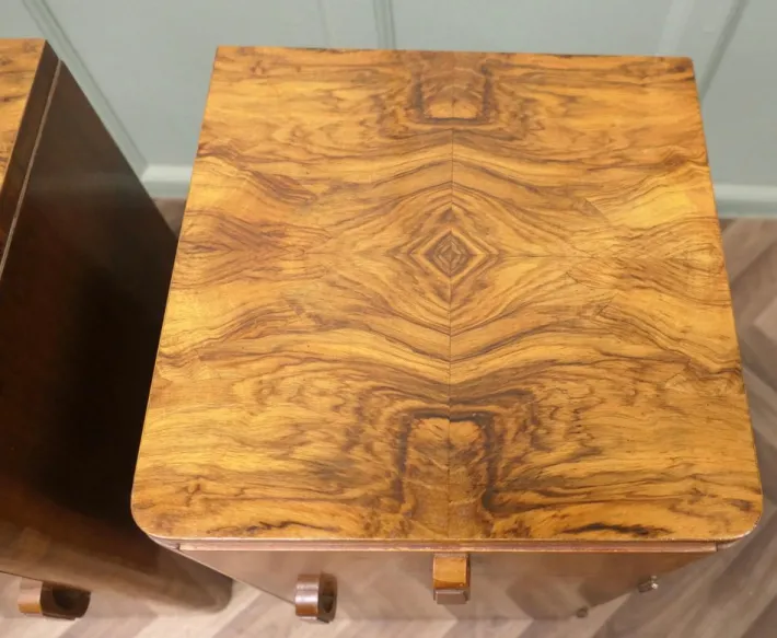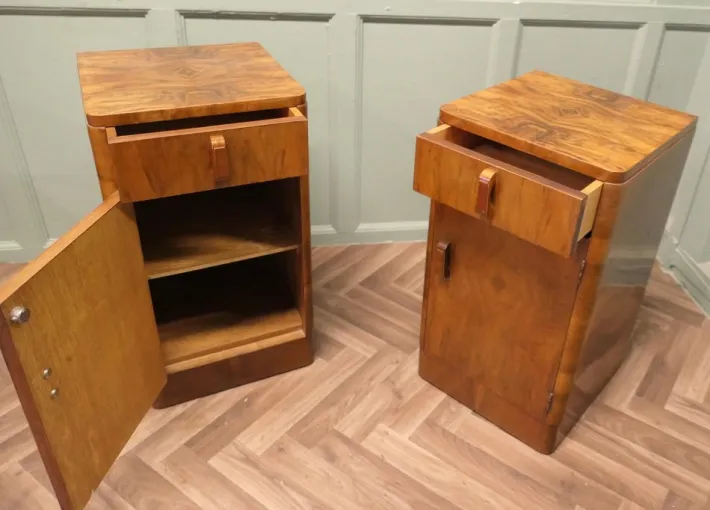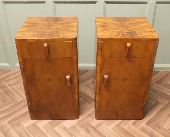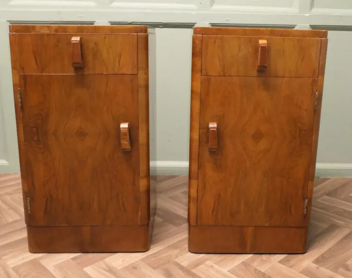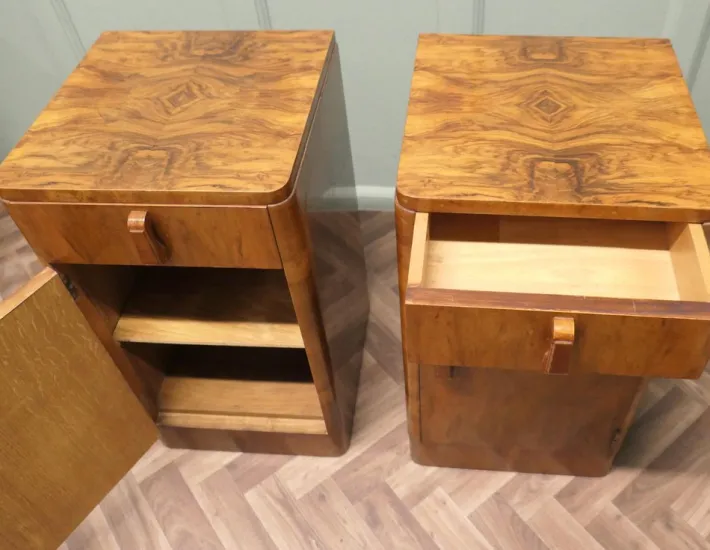 This is a very Stylish pair, each one has a drawer over a shelved cupboard, the cabinets have hand made sculptured wooden handles. The cabinets are in good condition with very little signs of use to the very attractive mirrored walnut veneer finish