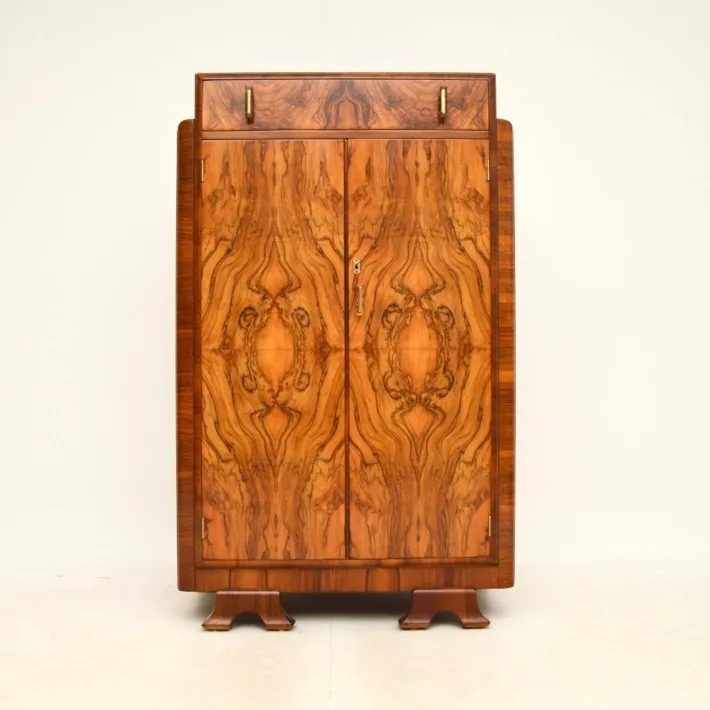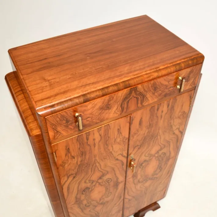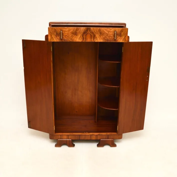 It is of superb quality, it’s extremely well made and is a very useful size. The large lower two door compartment contains shelving and a hanging rail, there is also a useful upper drawer. There are lovely Bakelite and brass handles, this stands on a very interestingly designed base. The figured walnut grain patterns are absolutely gorgeous and this has a stunning colour tone.