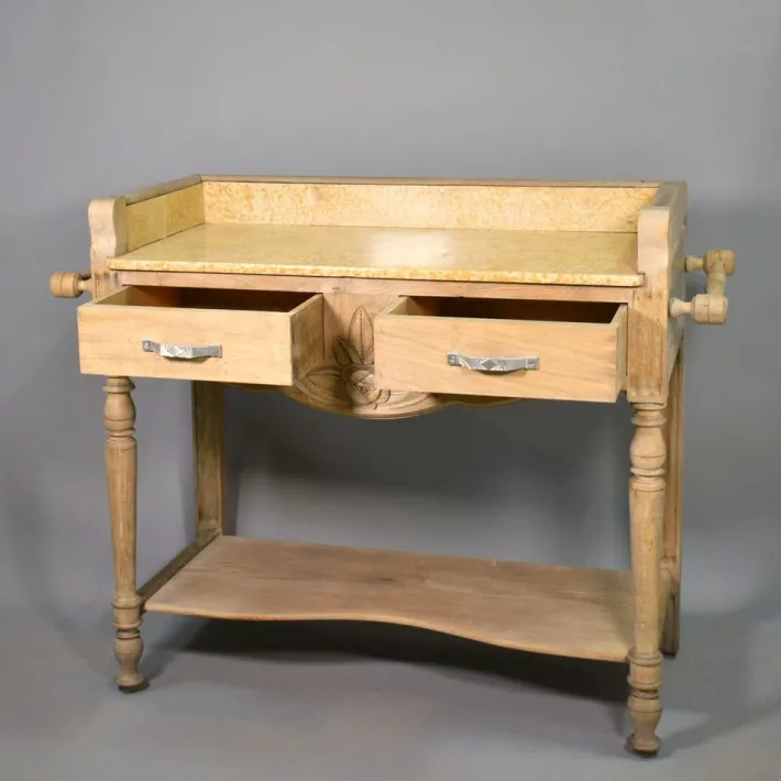 In solid bleached oak the washstand features an inset variegated marble top and surround. It is unusual to find marble of this colour.