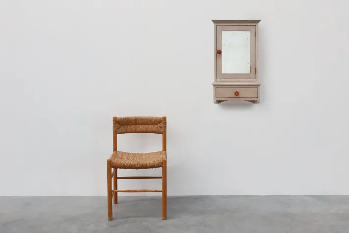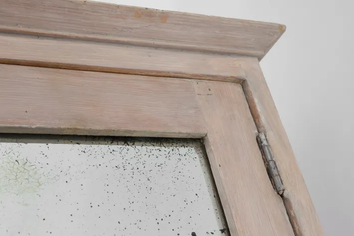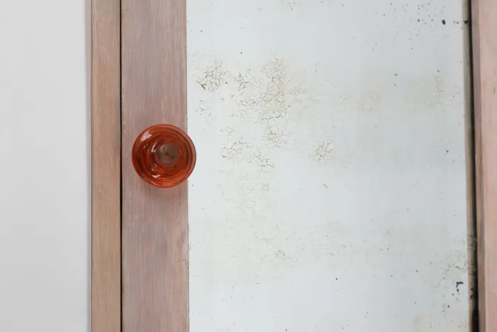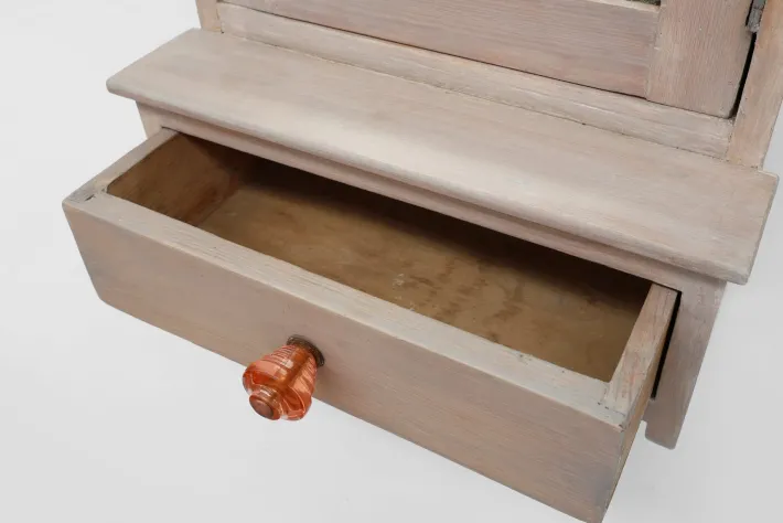 Charming small wooden wall cabinet with a mirrored door and a drawer underneath. Made in France in Art Deco style in the 1920s. This cabinet in a light pink color has a very nice patina and a beautiful weathered mirror. Behind the door you’ll find two practical shelves. The contrasting orange glass door knobs on make this shaving cabinet a real eye catcher.