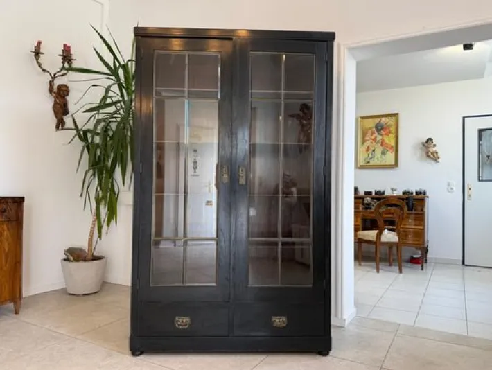 Original Art Nouveau display cabinet from around 1900, made in elegant black with an impressive Tiffany glass front. The piece of furniture impresses with its straight, clear Art Nouveau design and perfectly showcases your collectibles or decorative objects. The display case is keyed, the inside is fragrant and well-maintained. It is in very good condition – an authentic piece with character and charisma. As it is delivered assembled (cannot be disassembled), you can use the piece of furniture straight away and integrate it into your living environment. The combination of the deep black surface and the interior fittings in particular creates a stylish effect. This piece is an absolute eye-catcher both for classic interiors and as an exciting contrast in modern architecture.