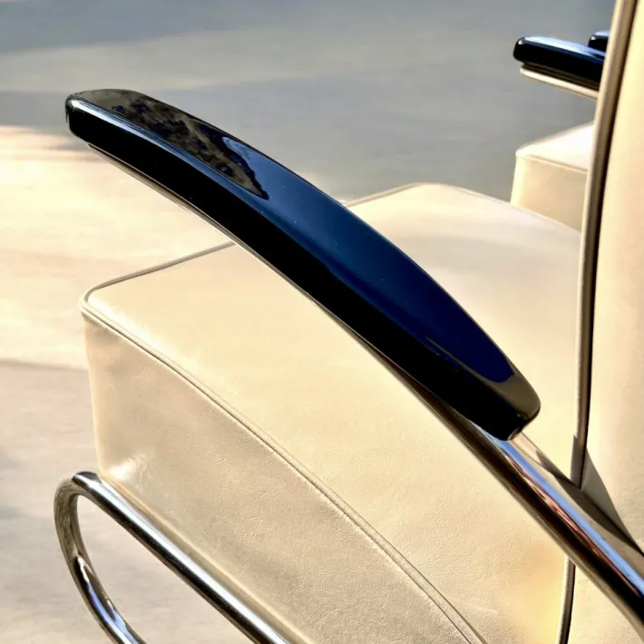 | Restoration and Damage Details | Light wear consistent with age and use, Patina consistent with age and use, Reupholstered, Partially restored, Surface has been polished, Surface has been refinished, Restored, Professionally reupholstered, Reupholstered with genuine leather in the color beige/light beige, The beech wood armrests are painted with black piano lacquer, The chrome-plated tubular steel construction is polished |