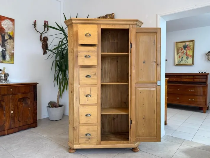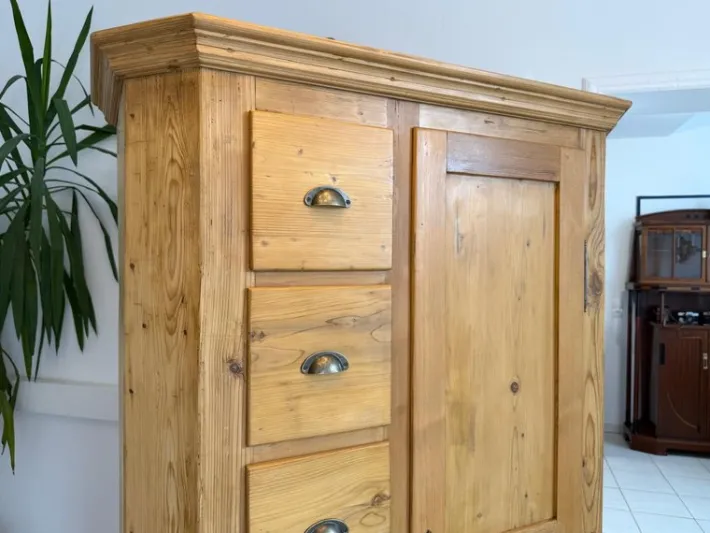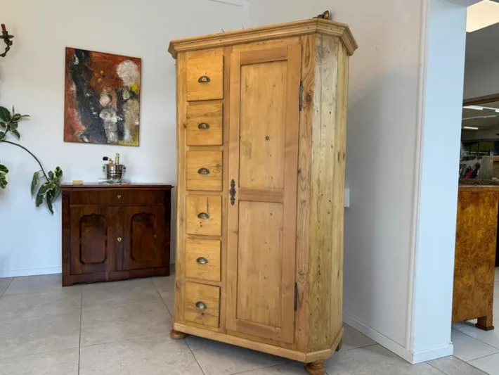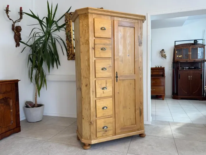 This beautiful, original Almerschrank / bread cupboard dates back to the late 18th century and is a true gem of Alpine craftsmanship. Made from solid *spruce wood*, the cupboard impresses with its robust construction and authentic, rustic charm – signs of age and inactive wormholes. Typical of the *Alpine style*, the cupboard is characterized by its clear lines and simple form, which are refined by artistic *hand carvings*. The wooden surface is in very good original condition. Inside the cupboard, spacious storage compartments offer ample storage space for textiles and other treasures. The original key is in excellent condition and testifies to the high quality craftsmanship of this piece of furniture. This bread cabinet has one door on the right, supported by visible hinges, and six practical drawers on the left, operated by added shell fittings. The lock is original and looks great—it’s naturally functional. Inside, this Almer cabinet has a fragrant, woody scent. The piece was restored with great care and skill, paying particular attention to preserving the cabinet’s original character and restoring it to excellent, usable condition. A unique, antique Almer cabinet, its history and distinctive charm lend a cozy and traditional atmosphere to any room. This emphasizes the historical value, the quality of craftsmanship, and the restoration of the cabinet, which underscores its traditional and aesthetic character. You should treat yourself to this original piece from our contemporary history while it’s still available!