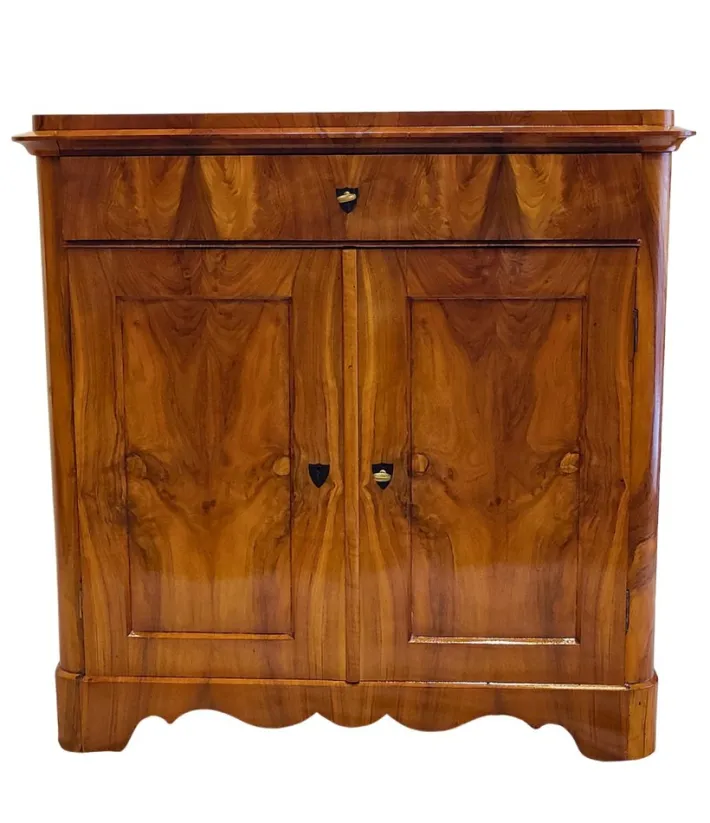 It features one drawer above two paneled doors, opening to a spacious compartment with shelf. The cabinet stands on a shaped base and displays warm patina and balanced proportions.