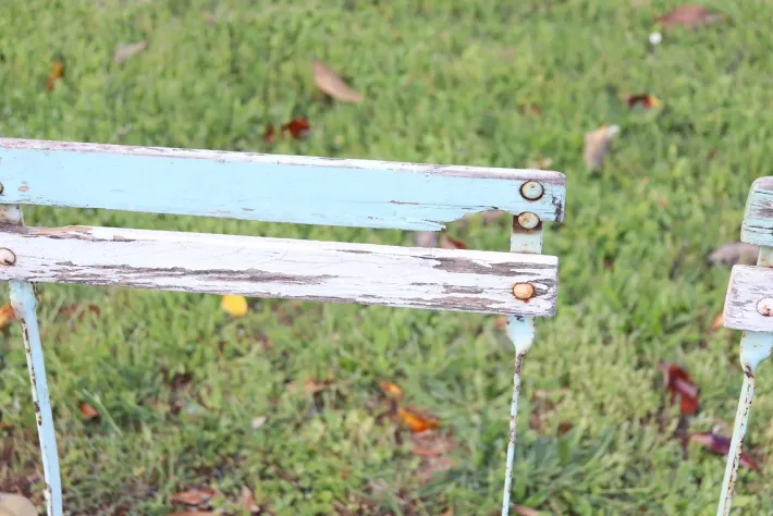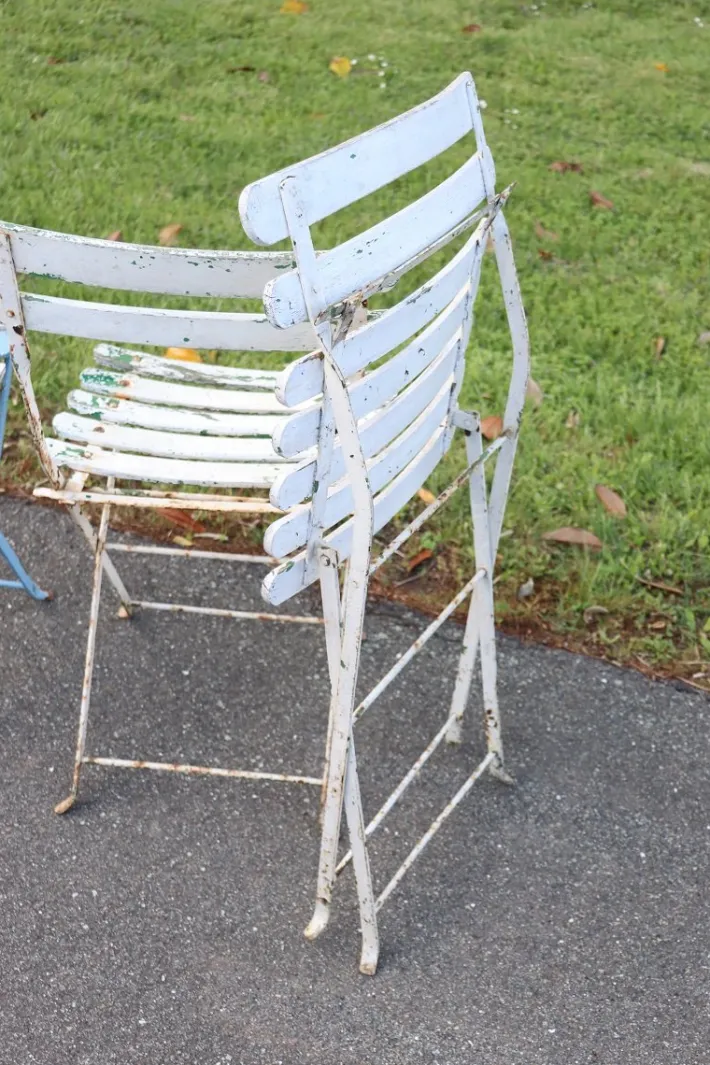 The frame is made of iron while the slats are made of larch wood, the folding mechanism allows for easy movement and storage when not in use. Lacquered in blue and white they are perfect for use as garden or patio furniture.