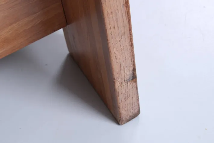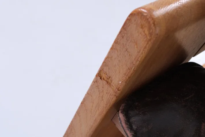 The dark brown genuin leather is still supple and of good quality without tears or weak spots. Lots of characteristic user marks, sometimes called ‘aviator leather’. The heavy light oak frame construction is very solid and has superficial usermarks. Seating height 37 cm.