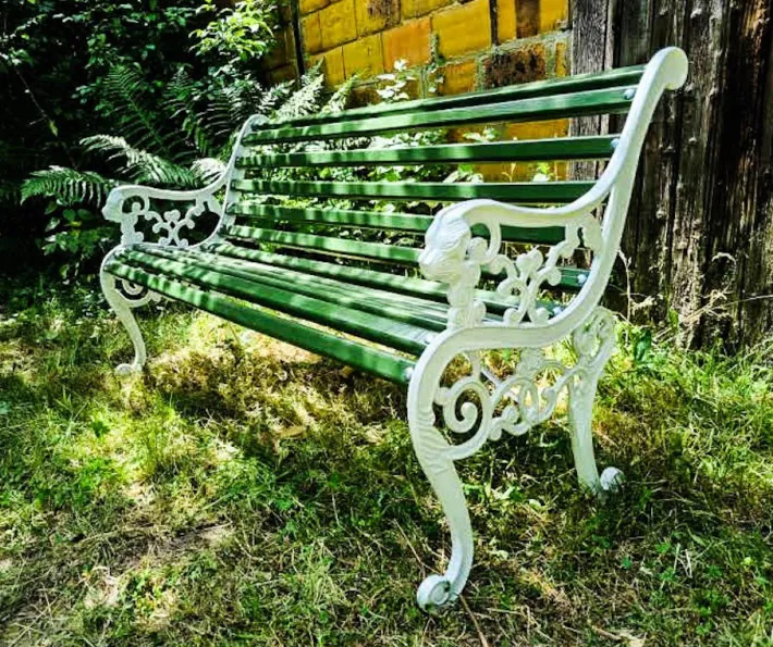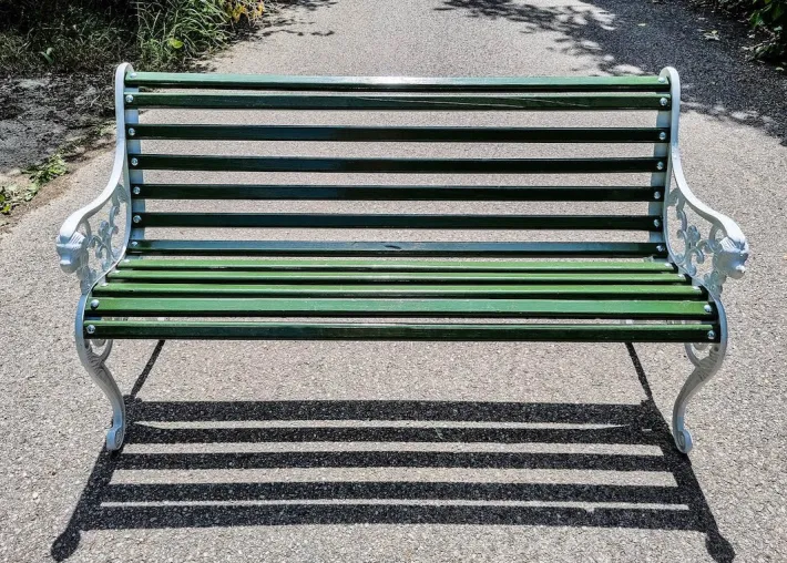 The cast iron brackets were sandblasted and repainted with epoxy. Once removed, the slats were stripped, sanded, and repainted with a highly weather-resistant resin-type paint.