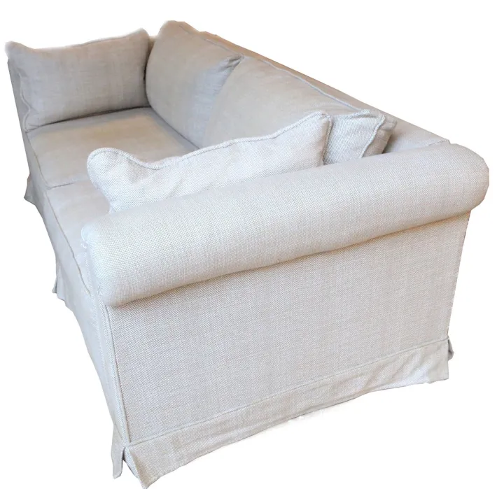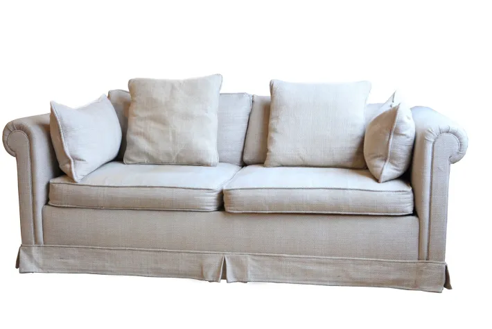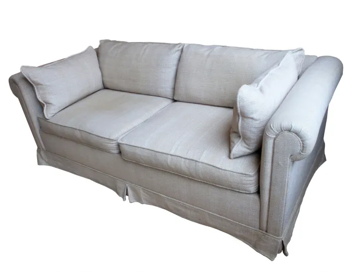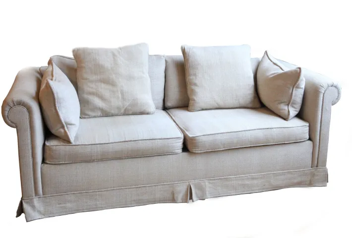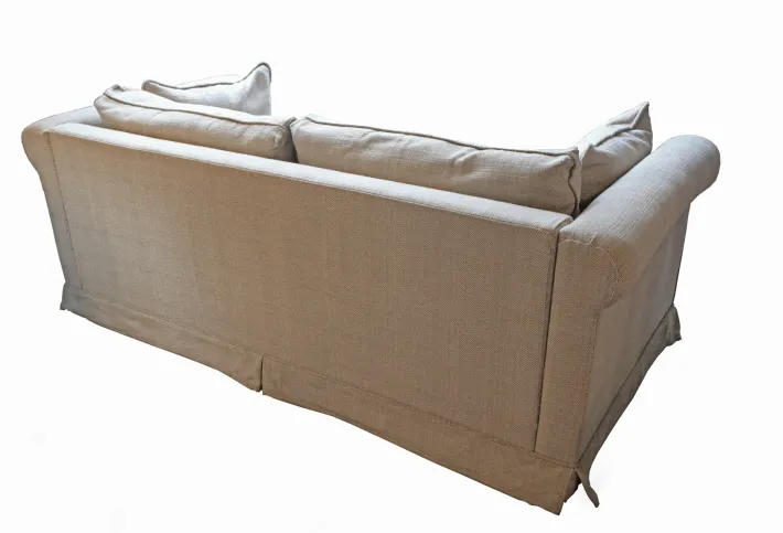 The sofa features two loose seating cushions and another two for the back plus four small cushions, two for the sides and two for the back.