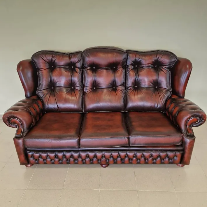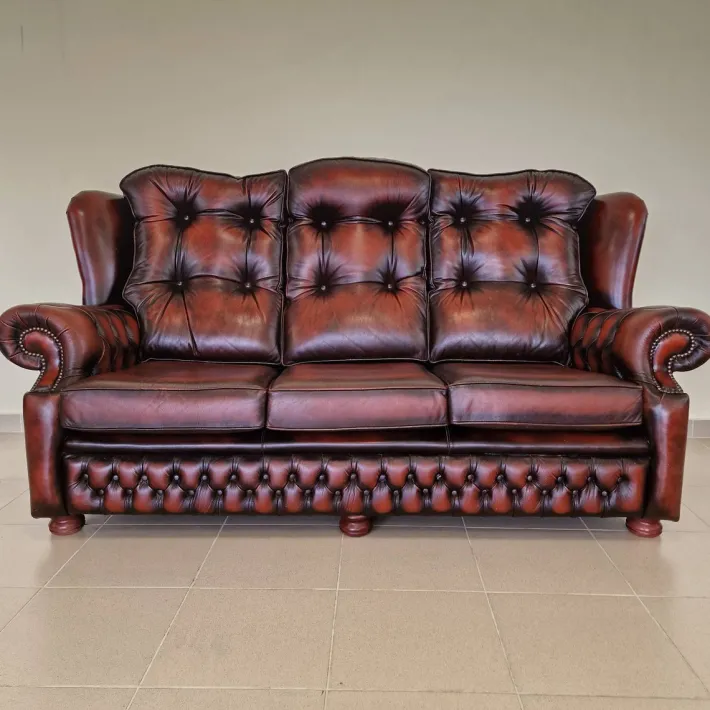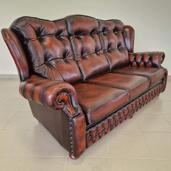 Extremely strong construction made of mahogany, genuine leather, buttons on the backrest, armrests and the lower part and all this is handmade!