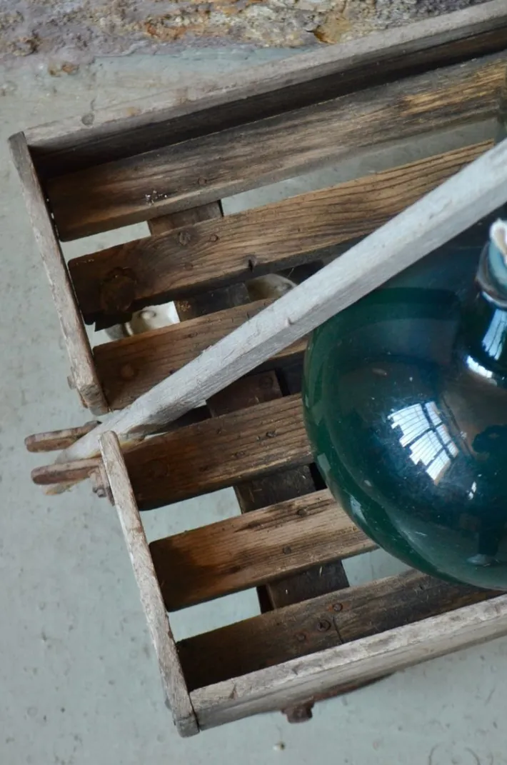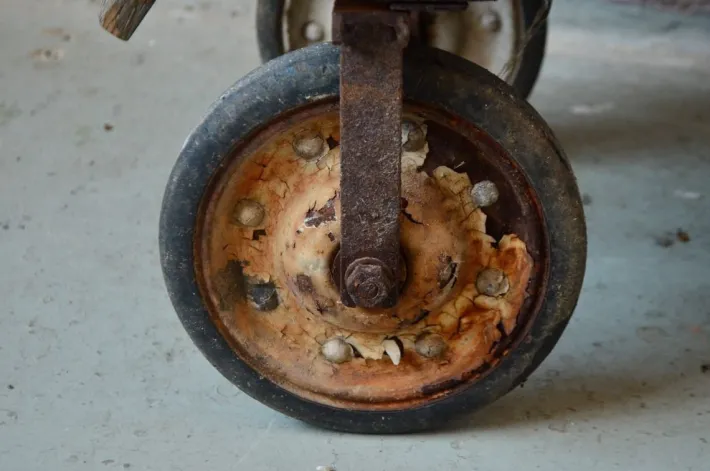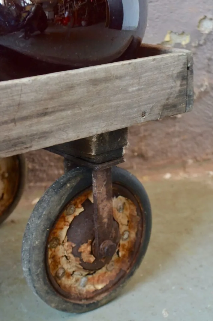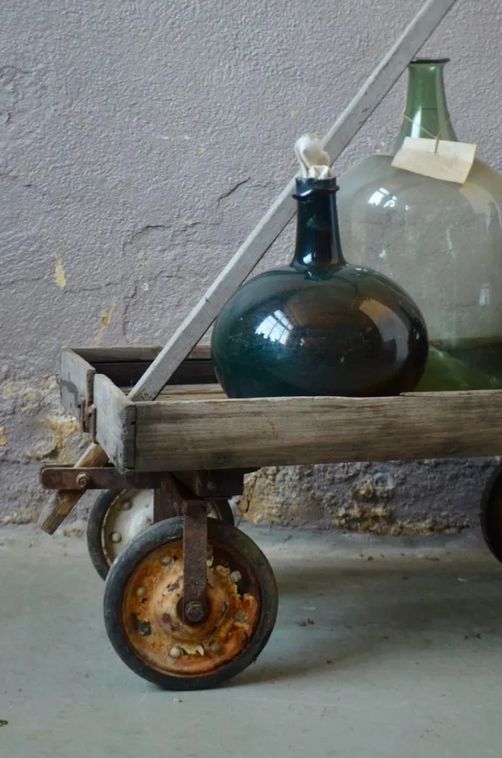 The cart has been used with intensity but remains perfectly functional. The front wheels are directional, the arm can be disassembled. It has been cleaned, the wood is waxed, it remains in its juice with many traces of life.