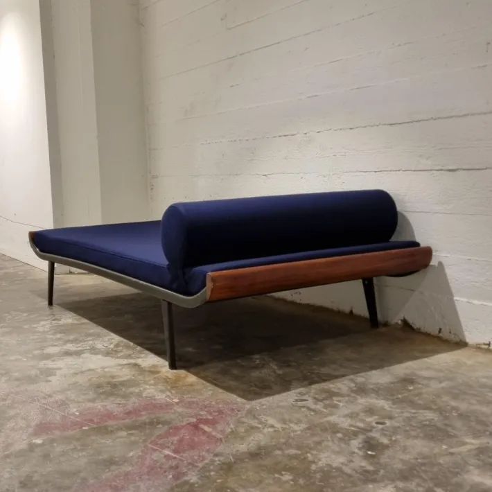 The Cleopatra daybed has a new mattress and wool dark navy blue wool fabric ‘Vilano’ by De Ploeg.