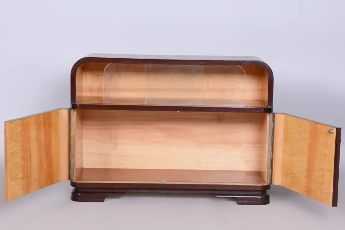 The cabinet is equipped with sliding clear-glass doors, which are fully functional and provide easy access to stored items. It has undergone professional restoration, including the revitalization of its original polish to enhance the beauty of the materials used. This is a distinctive piece of furniture that combines historical charm with practical utility.