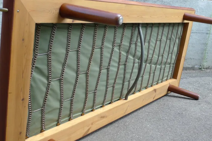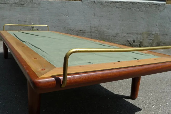 Frame in solid teak- and pinewood. The sides are edged with a solid