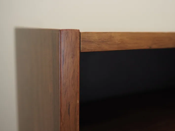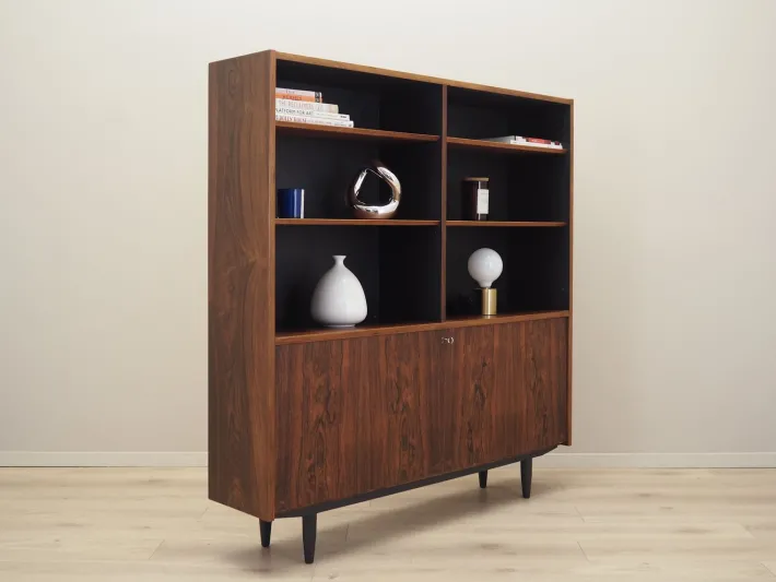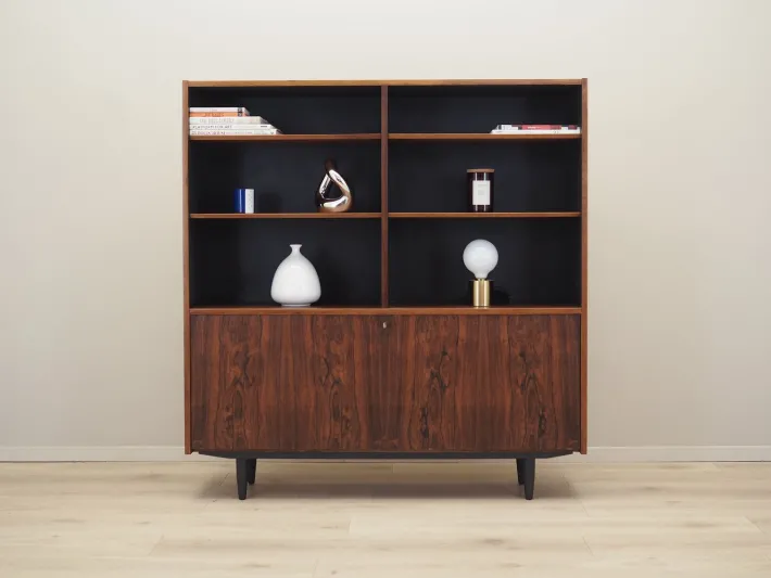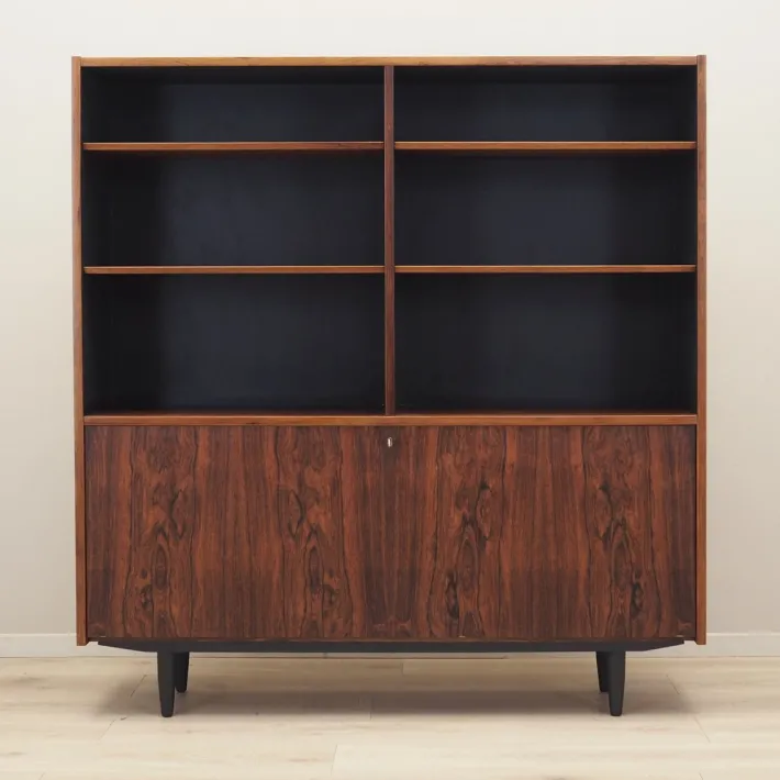 The structure is covered with rosewood veneer. The legs are made of solid wood stained black. The surface has been refreshed. Inside, the space is filled with four practical shelves with adjustable heights. The bookcase is the perfect solution for a large collection of books or collectibles in a small living space. An additional advantage is the universal bar, inside which there are five adjustable shelves. Key included.