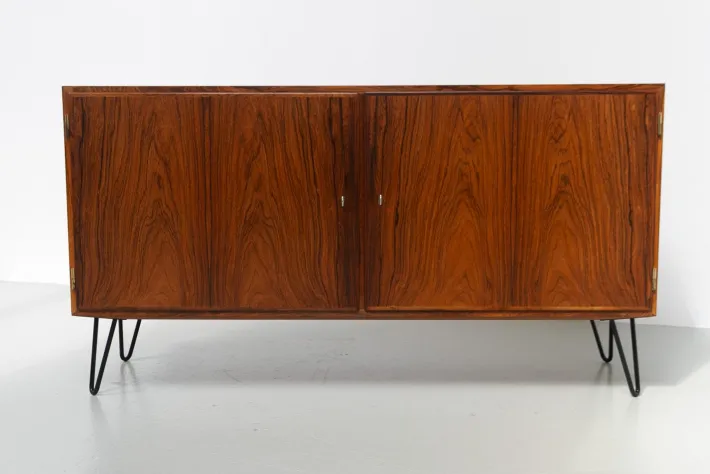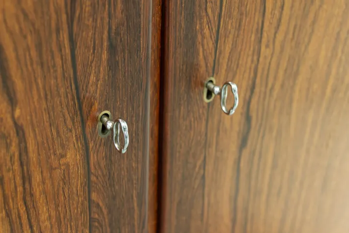 Stunning Scandinavian Modern rosewood/palisander cabinet with vivid grain pattern. Double hinged doors with brass hinges and locks with keys. Inside is finished in light Ashwood. Two compartments. Two height adjustable shelves and three height adjustable drawers.
