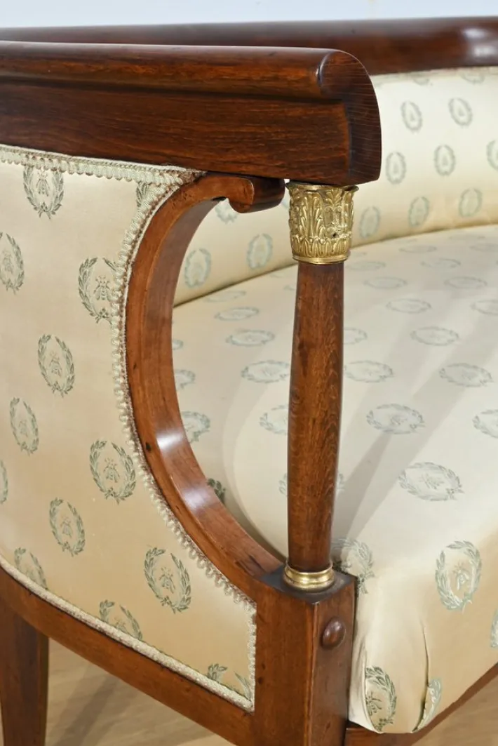 The seat is covered in a cream fabric, in used condition, decorated with motifs of bees in a crown, an imperial symbol.