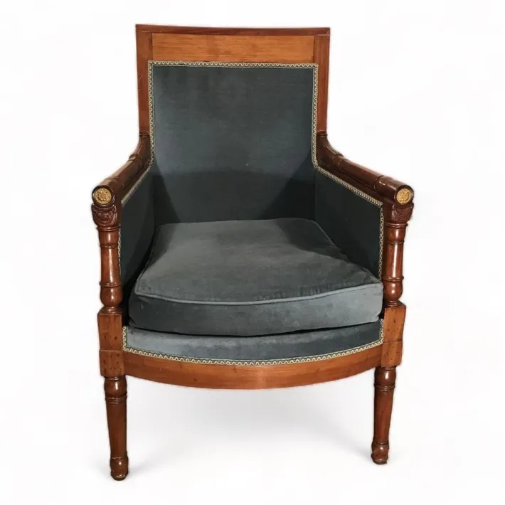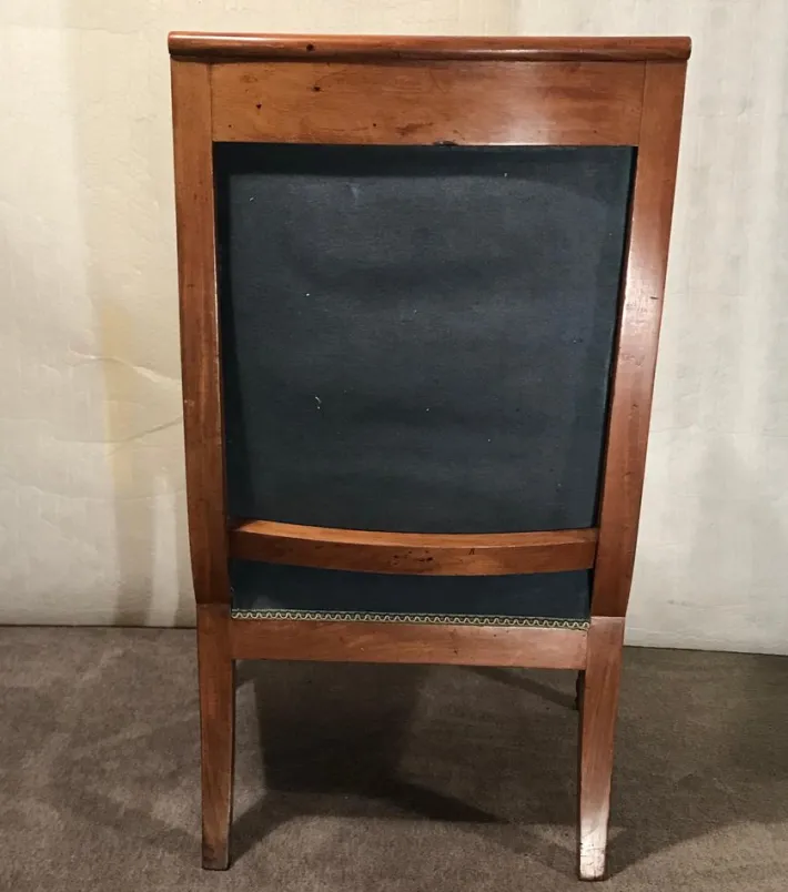 Details: The upholstery of the chairs is a blue velvet fabric. The deep, rich hue of the velvet complements the mahogany frame, creating a harmonious blend of textures and colors. The choice of blue velvet not only adds a regal touch but also enhances the overall opulence of the salon suite. Despite the passage of time, these chairs remain in remarkably good original condition, a testament to the quality of craftsmanship and materials used in their creation. The enduring charm of the Elegant Empire Salon Suite lies not only in its historical significance but also in its ability to seamlessly integrate into contemporary spaces, bringing a touch of the past into the present. We also offer a matching sofa which was originally part of this salon suite.