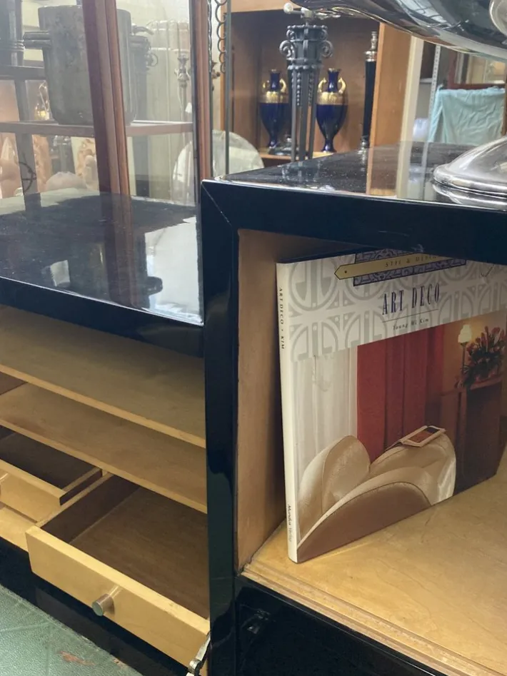 Original handles. Original green leather plate with slight signs of wear. Very elaborately crafted silver-plated key. Black high gloss painted by a specialist. The fine interior was elaborately manufactured. Step-shaped structure with a small display shelf with glass panels. This gives the secretary a certain lightness and can be used multiple times.
