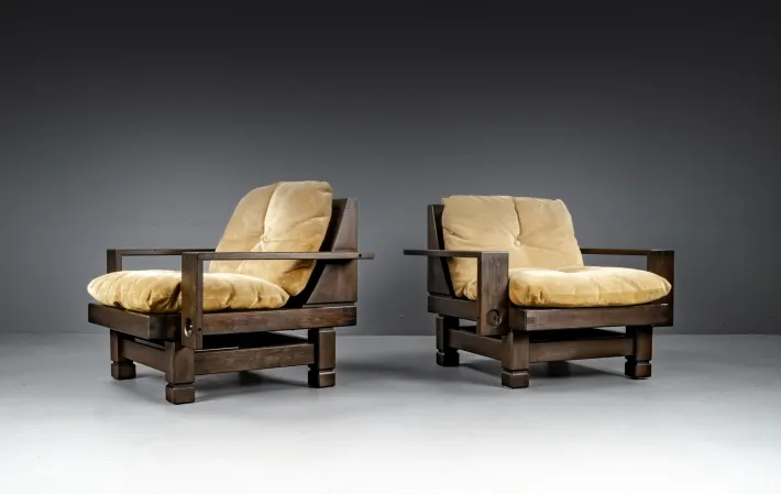 The color play of these chairs and the suede cushions is very diverse and, depending on the different incidence of light, ranges from darker brown tones to almost silvery-light beige tones