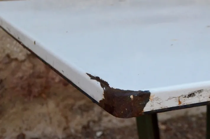 The table is antique, entirely made of metal. The welds are perfect. The top is in white enamelled sheet metal, the base is in green painted iron. Non-perforating points of oxidation and a jump of enamel are visible, the patina is intense. The table is stable and has a factory, authentic garage look.