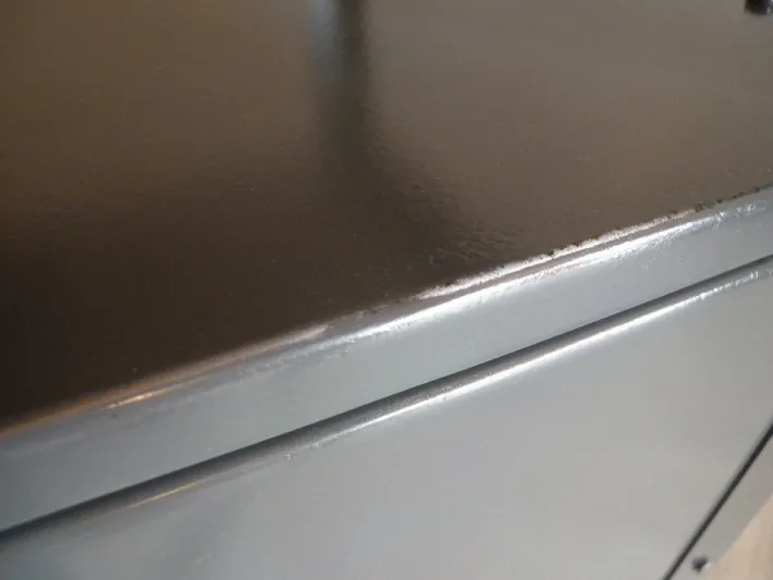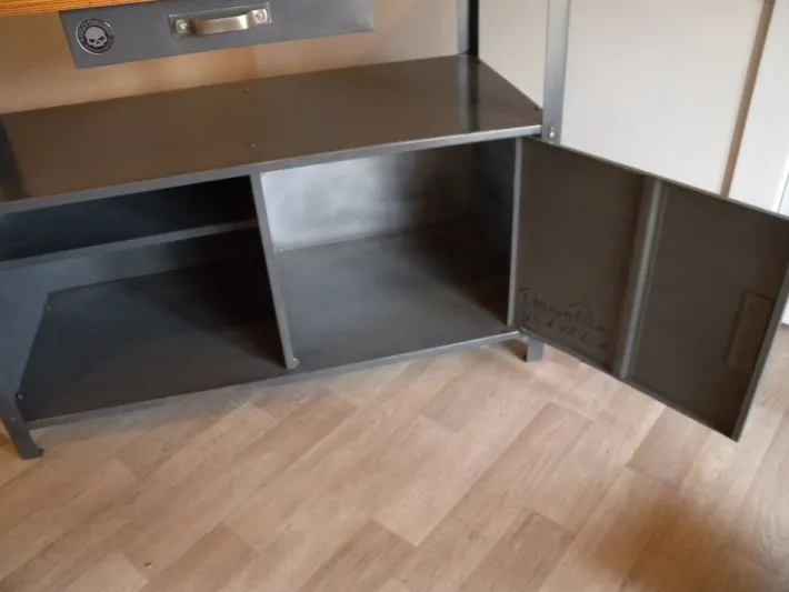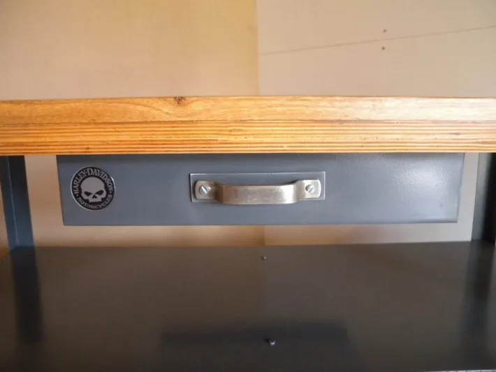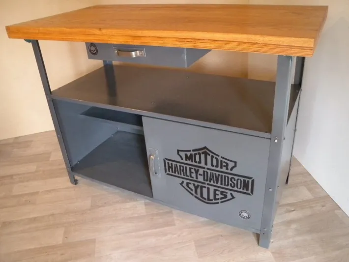 The workbench has been restored, according to the previous owner, the workbench comes from a Harley Davidson Showroom workshop.