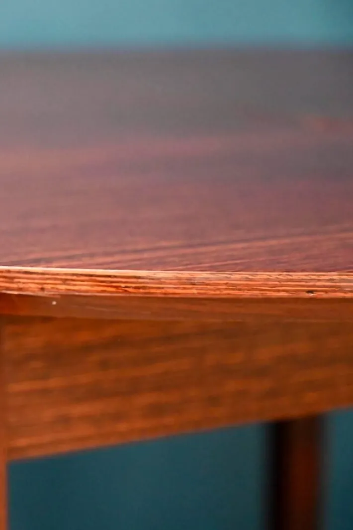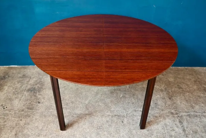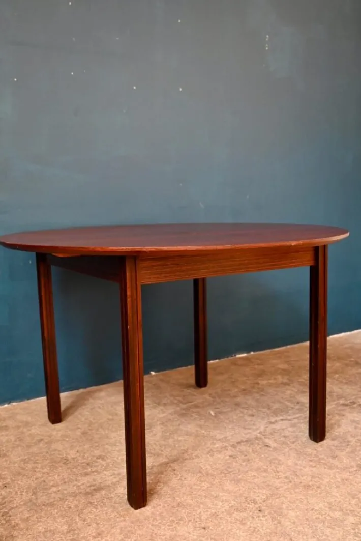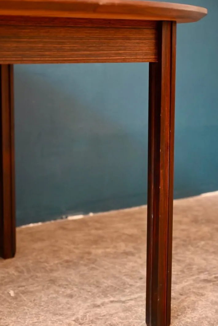 The table is old and dates from the 70s. It is made of rosewood and rosewood veneer. Its particular base is made of solid wood, removable. The round top has a nicely beveled edge. Italian extensions are integrated under the top. The table is in good condition, however swelling in the veneer is visible, particularly in raking light, as visible in the photo.