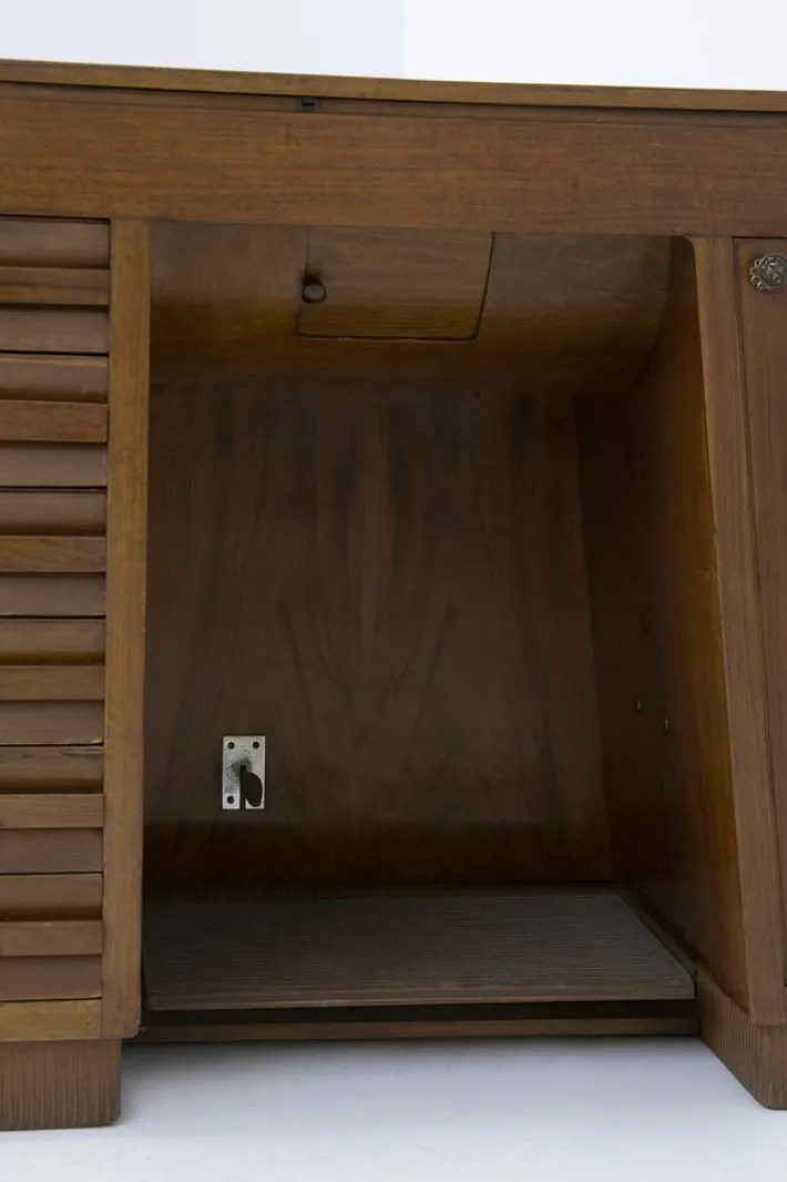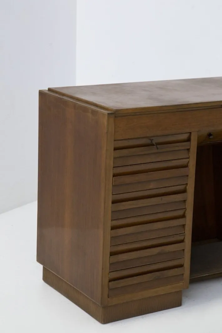 Being transformable the desk is excellent both as a writing table but also as a piece of furniture for designer living rooms. Wear consistent with age and use. Minor losses. The desk is in its original condition, the wood has scratches.