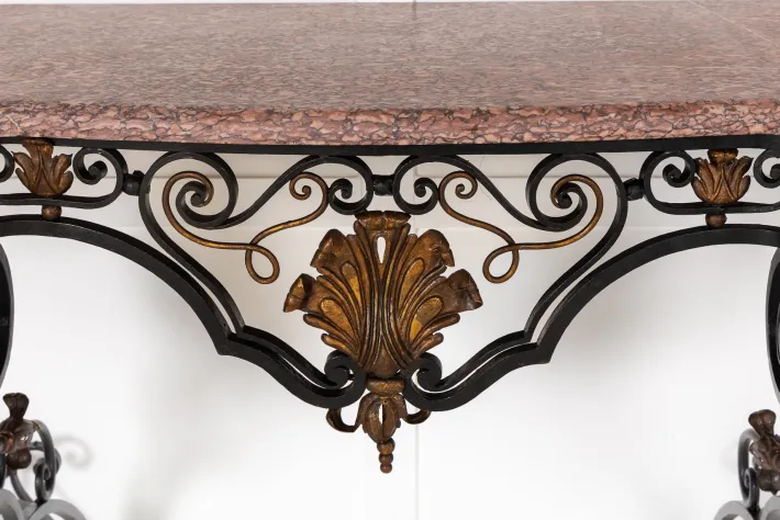 Of interesting shape, this table has a lovely marble top supported on a wrought iron and parcel gilded console frame base. It is of particularly large and important size, and was probably designed for a grand house. The rococo revival design of the base, has a stylised shell design in gilt, and is finely worked and beautifully balanced in both practical and decorative terms.