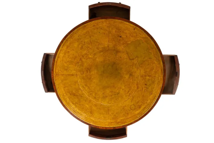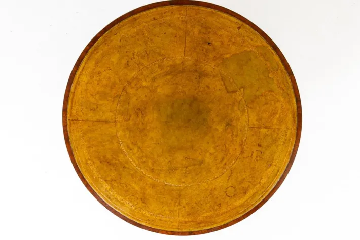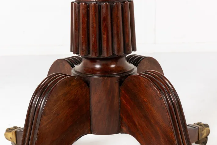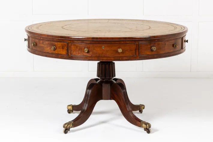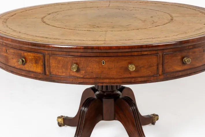 Of large size and good proportions and interesting column support, this is a beautiful example of a regency drum table. It has four working drawers and four dummy drawer fronts, all with cast gilt brass handles with flower and beaded decoration. The top retains the original faded and patinated leather insert, with almost all of its intricate and attractive gilt tooling. The collar on the column support has very distinctive reeded detailing, often associated with the Gillows firm. The hipped cabriole legs seen on this table are also seen on various marked Gillows pieces and it is therefore quite likely that they were the makers of this particular table. The quality of the mahogany used throughout is certainly of the level expected of a top quality firm. The legs terminate in paw form castor caps which are very finely cast and nicely finished.