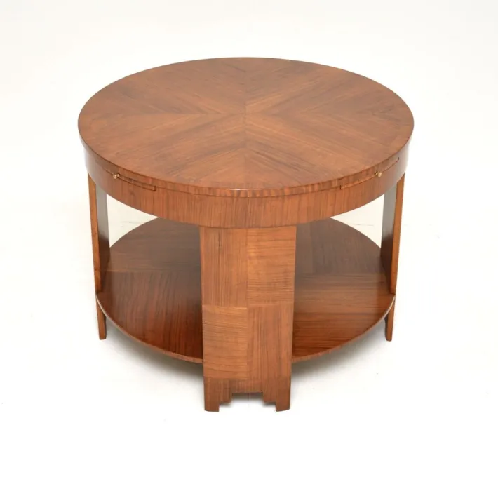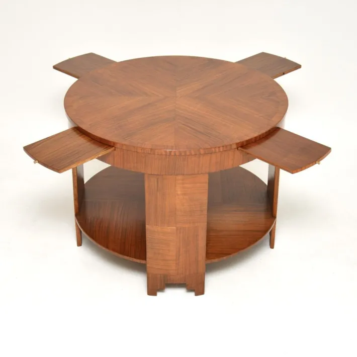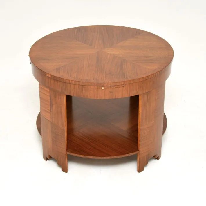 It is of superb quality and is a most impressive size. The circular top has four brush slides that pull out from the edges with small brass handles. The walnut is veneered with a beautiful starburst pattern on the top with cross banded edges. This also has a very useful lower tier.