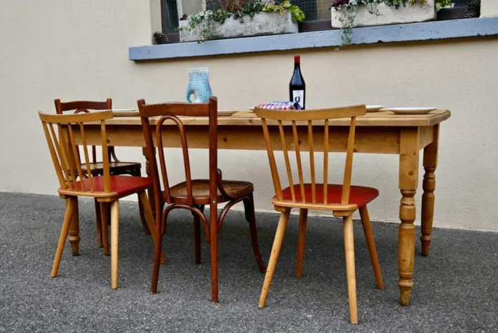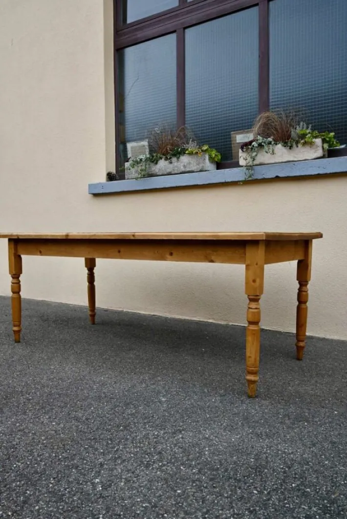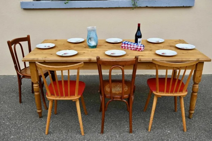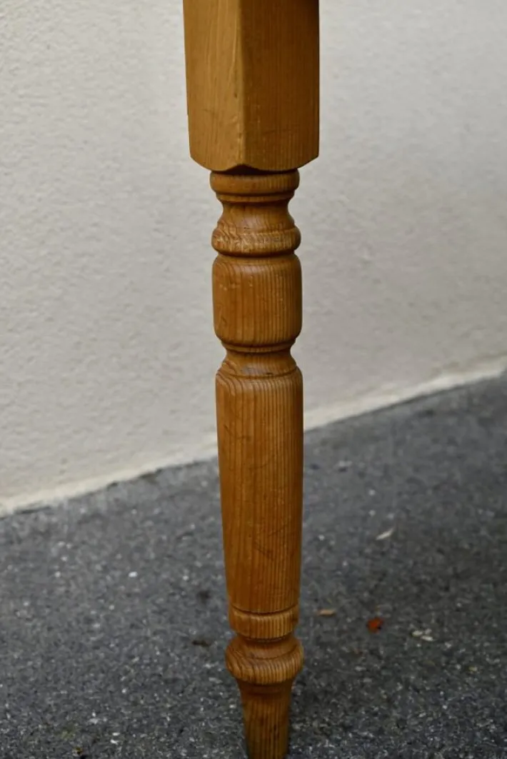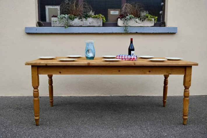 The table is old and dates from the 1970s. It is in solid fir, the golden shade is soft. The feet are removable. It is in very good condition. Small traces of use are visible. We have 8 tables in this model.