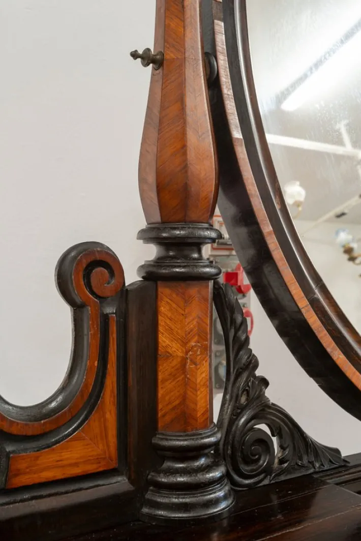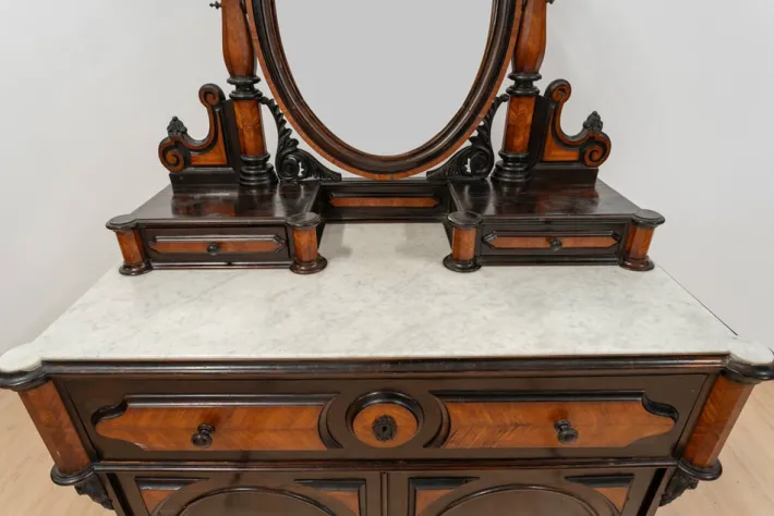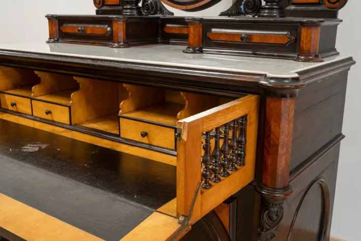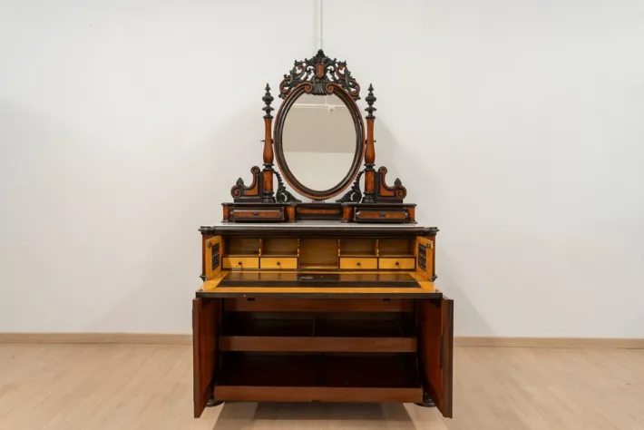 Maphole with a swinging mirror on two drawers supported by a white marble lid, a single waist drawer that hides a desktop made in sicomoro with drawers and drawers, in the lower body two doors with three interior dresser drawers.