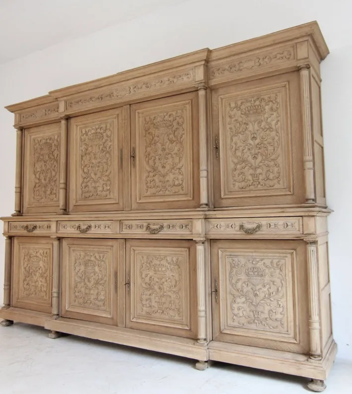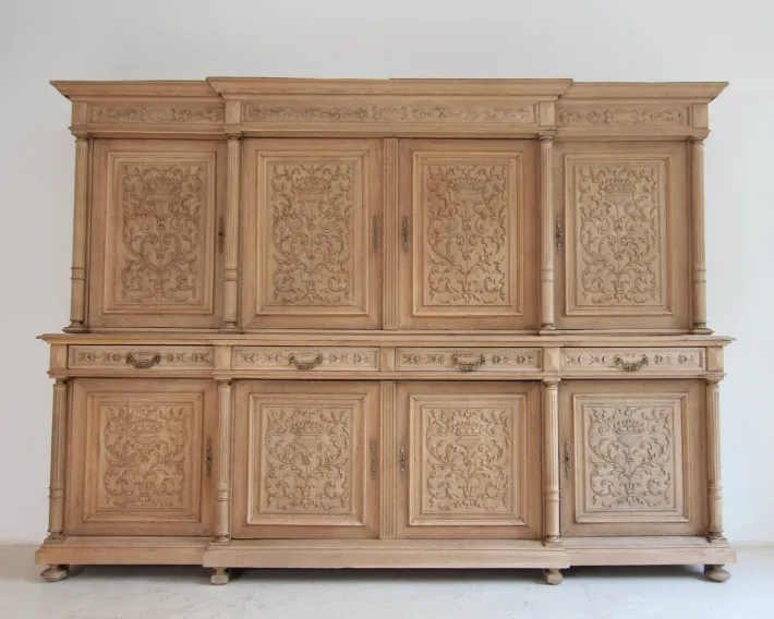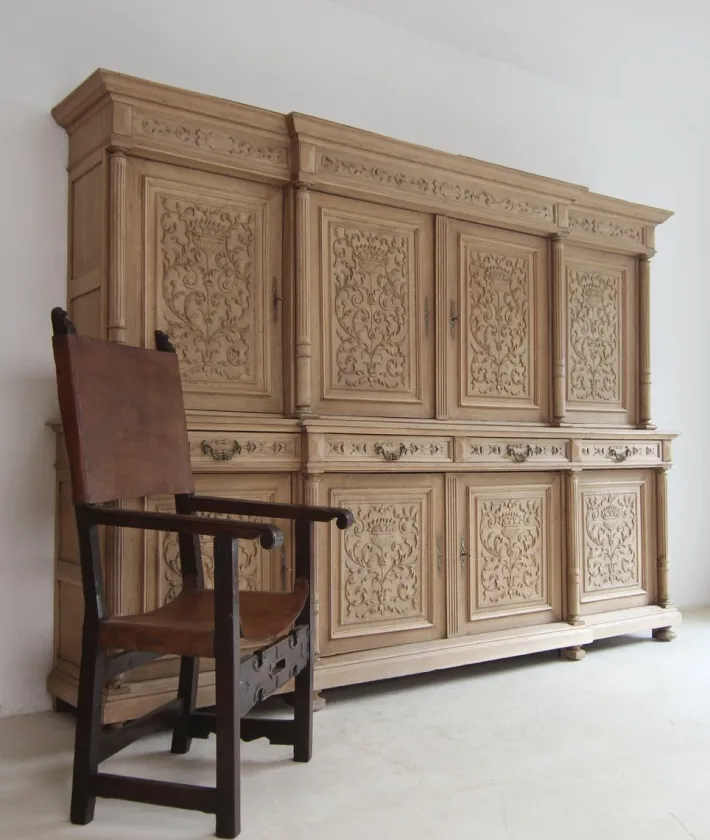 Two-piece side-coffered oak body with 8 doors and 4 drawers, standing on 8 feet. The front with a central risalit is symmetrically divided by 4 fluted columns on the upper and lower sections. Each double door is flanked by 2 single doors in a frame and panel construction. Profiles and relief-like floral and ornamental carvings decorate the door panels, drawer fronts and cornice.