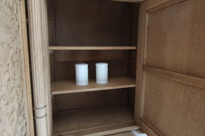 Good condition with slight signs of age-related wear, including minor damage, e.g. to individual column bases (see photos). Three missing shelves have been added. The old dark surface coating has been removed from the outside of the wood and bleached, so that the natural texture of the old oak wood now appears unsealed and light in colour.