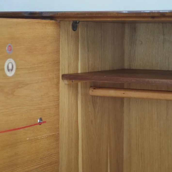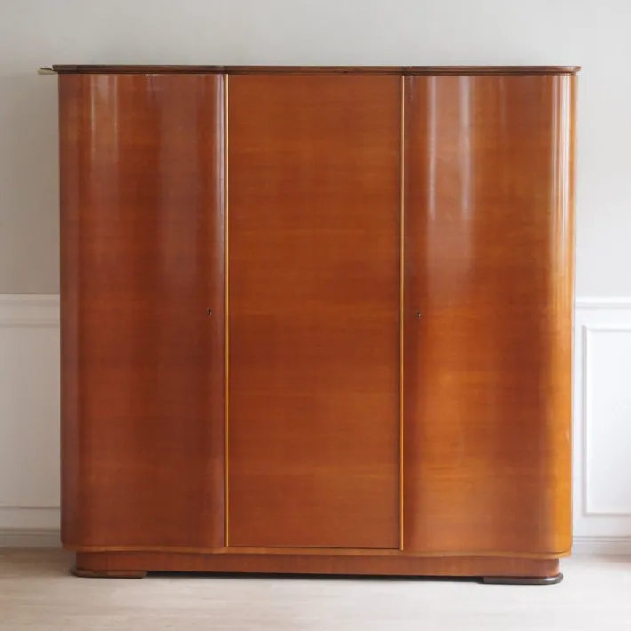Origin: Made in what was then Czechoslovakia – Originally designed as a wardrobe in the bedroom, today it can be used in a variety of ways as a wardrobe, coat cabinet or stylish storage solution in the hallway Features: Elegantly curved front, glossy veneer, minimalist skirting board Interior with clothes rail, hat shelf and numerous shelves Ideal as a wardrobe in the bedroom, as a stylish hallway cabinet or as a vintage accent in a modern loft Condition: The wardrobe is in very good condition. There are minimal, age-related signs of wear that underline the vintage character of the furniture. The doors and hinges work perfectly and the interior is clean and well preserved.