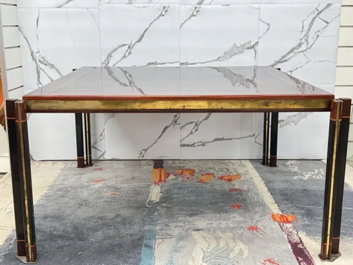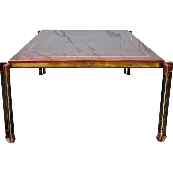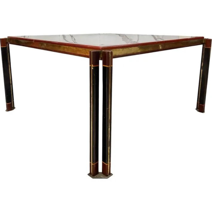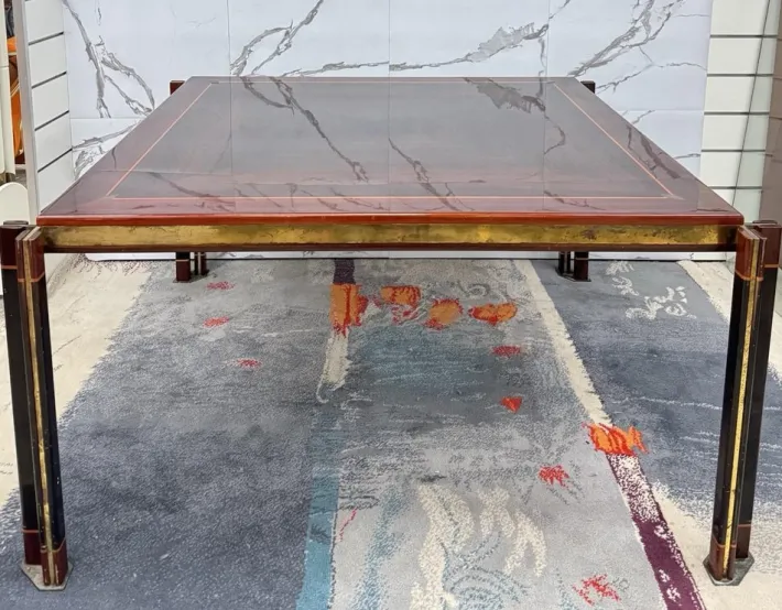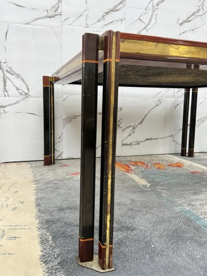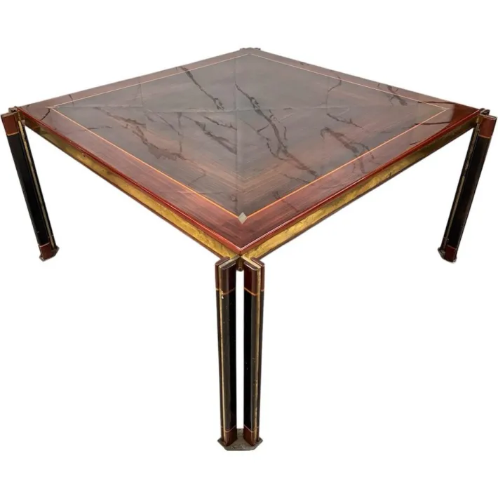Period: 1970s Designer: Paolo Barracchia Production: Roman Deco Materials: Brass, lacquered and inlaid wood Size: 155×155 cm, Height 78 cm