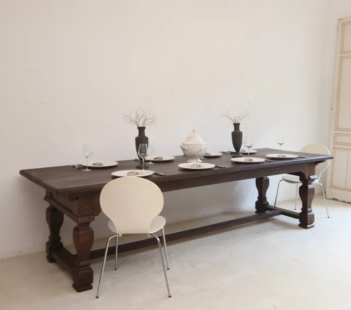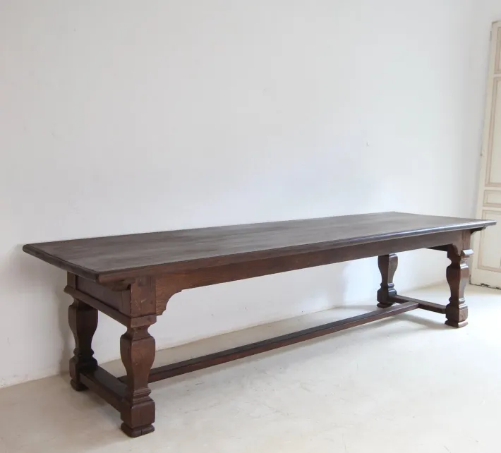 Rectangular table frame consisting of 4 square baluster legs connected by a frame and H-strut. The table top is protruding and profiled all around.