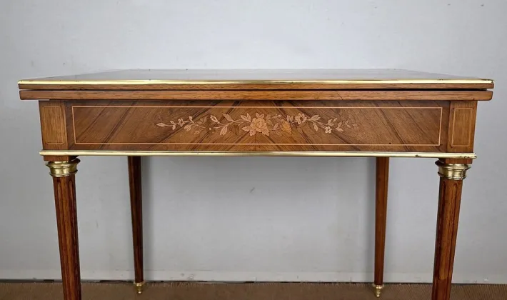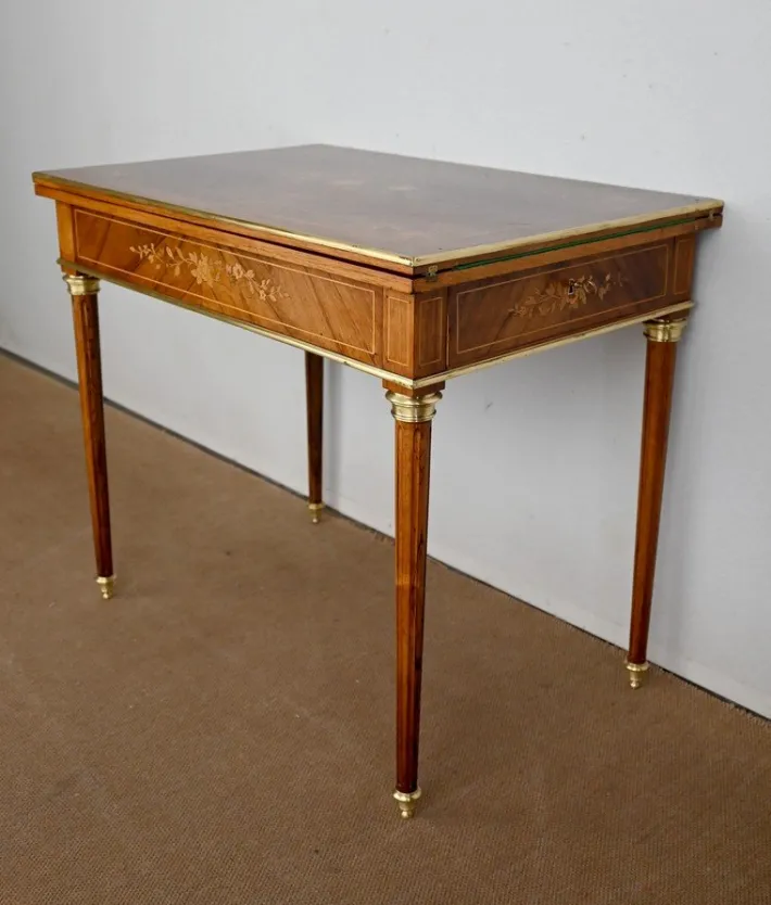 This tray is sliding. One of the parts, on brass hinges, gets up, in order to develop completely and rest on the open drawer. Thus unfolded, this table offers a large playground, with tender green felt, surrounded by a braid. The perimeter of this panel is tab cutting and has two nets.